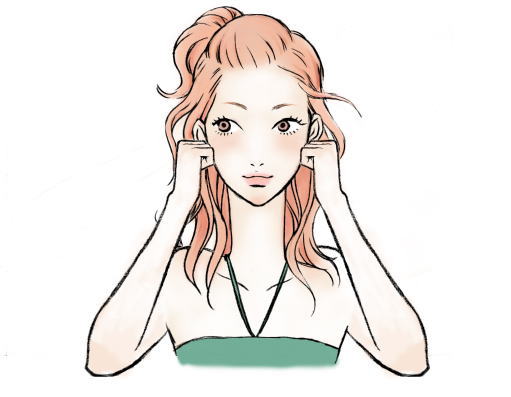 次は頭蓋骨のゆがみです。頭蓋骨のゆがみは、顔のゆがみにも関係しているのです。まず、側頭部に手のひらを置いて、指を後頭部に添えてください。そこから後ろ側に引っ張るように押します。5秒間を3回行います。あまり強くやり過ぎず、心地よく感じるくらいの力加減で行ってください。